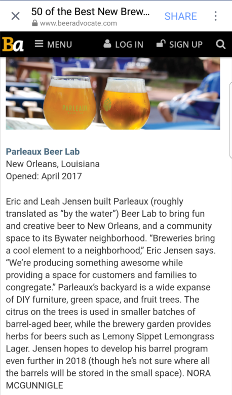 - Parleaux Beer Lab, New Orleans, opened March 2017